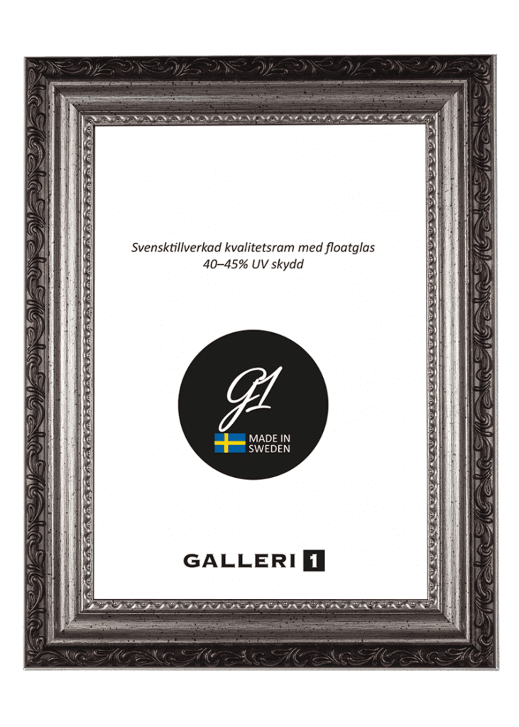 PS288S är en vacker kompositram i silver med fina utsmyckningar. Den levereras med floatglas och bakstycke med upphängningsöglor för både vertikal och horisontal placering på vägg. Bakstöd finns upp till storlek 21x29,7.