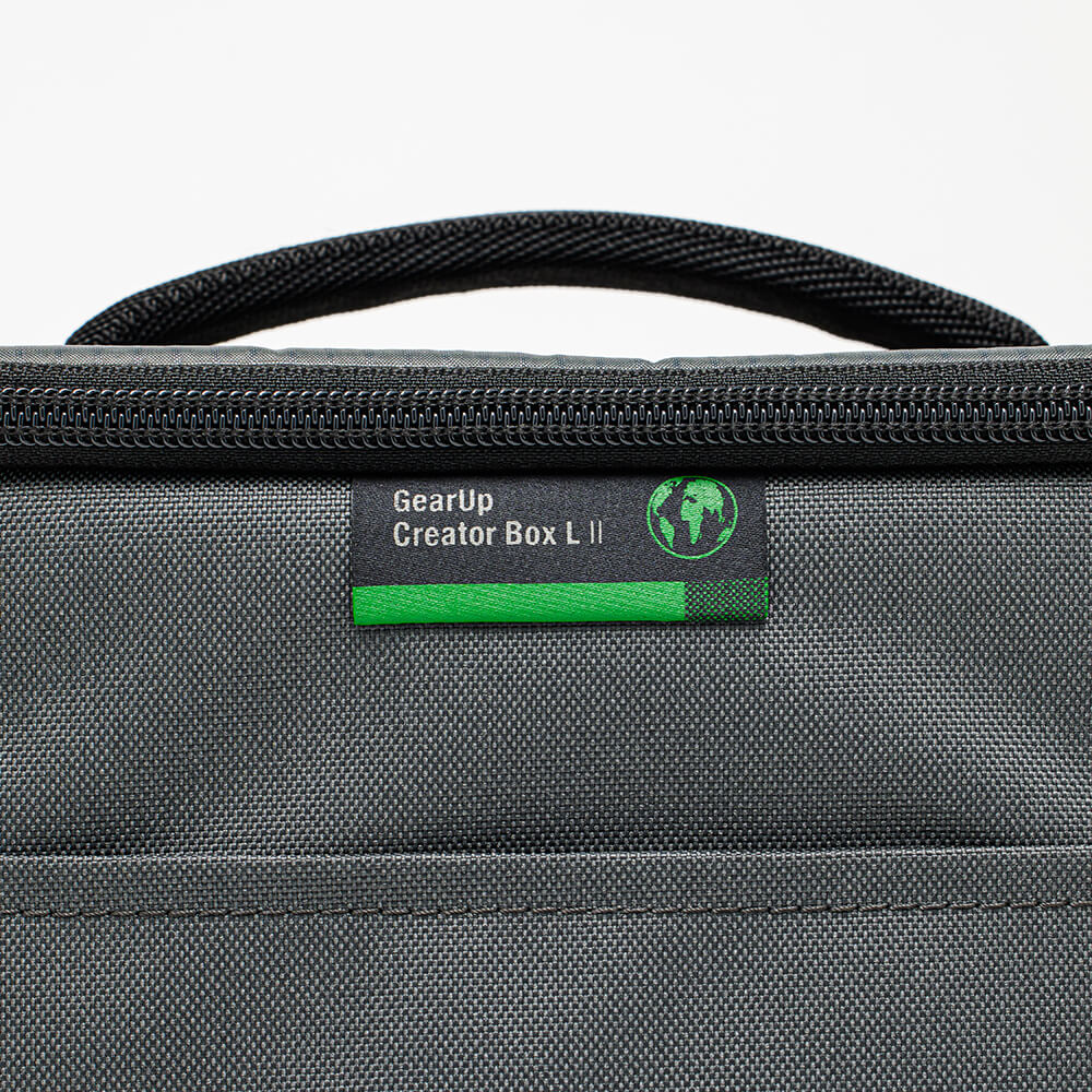 GearUp Creator Box Large II är en del av Lowepros ansträngningar för hållbarhet genom Green Line-projektet. Den har uppdaterats för att inkludera 81 % återvunna tyger (inklusive alla tyger, vävband, bindningar, blixtlåstejp, snören och nät) för att minska dess negativa påverkan på miljön.
