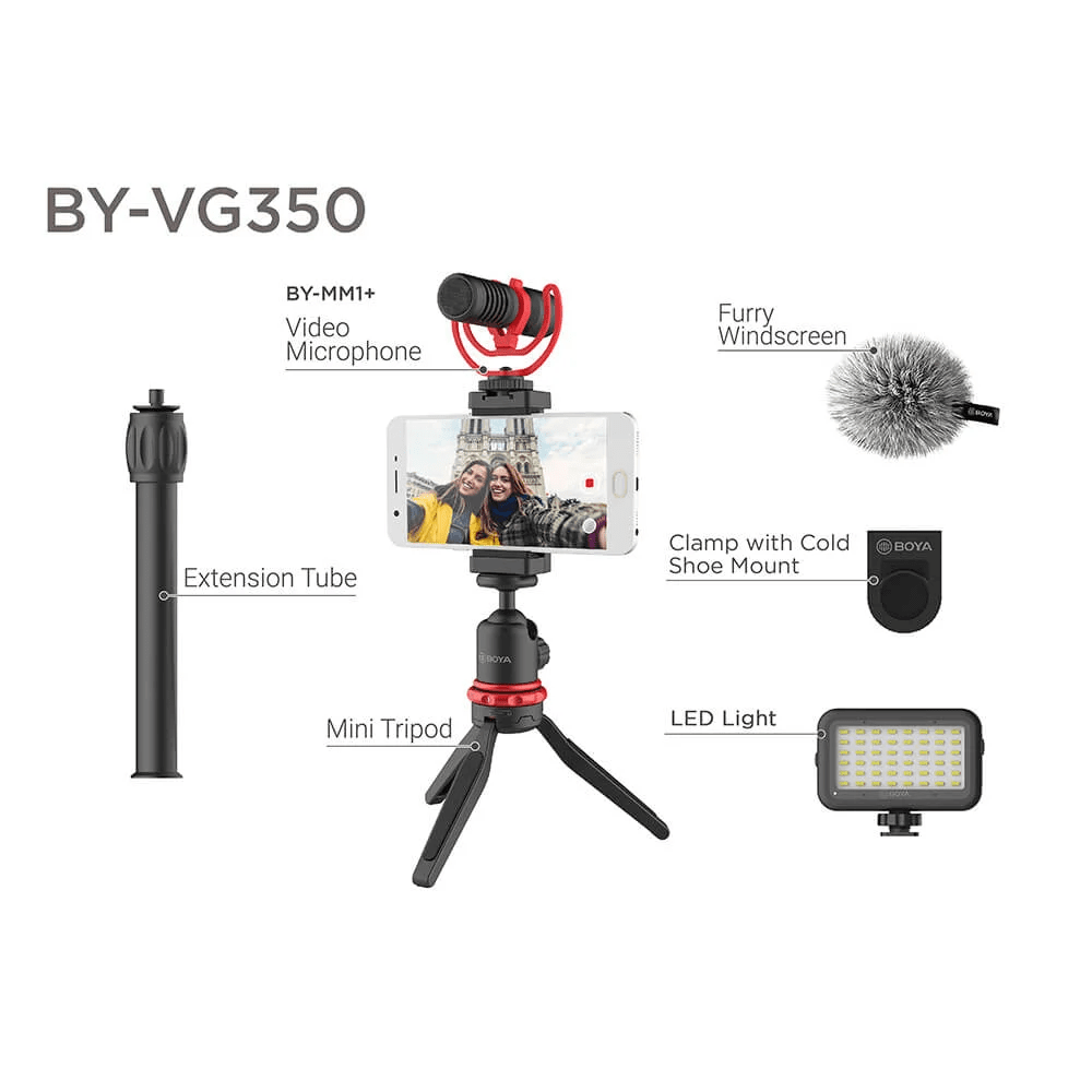 BOYA BY-VG350 är ett universellt videokit för smartphone som består av BY-MM1+ kondensatormikrofon, LED-belysning, smartphoneklämma, kulledshuvud, förlängningsrör, ministativ, klämma med tillbehörs-skofäste.