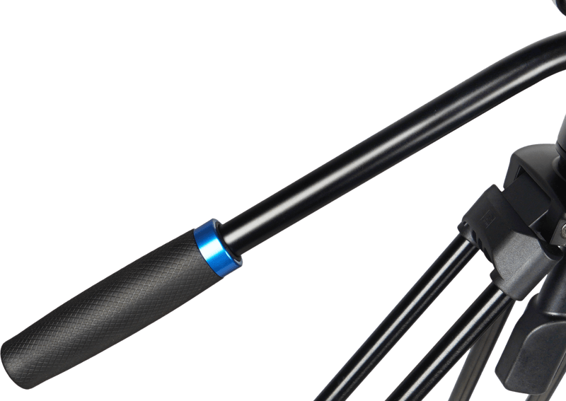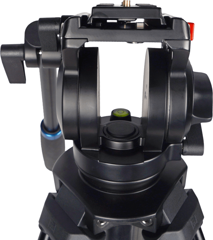 Stativet har möjlighet till nivellering genom att vrida på handtaget längst ner under videohuvudet och justera in huvudet i våg, utan att justera stativbenen.